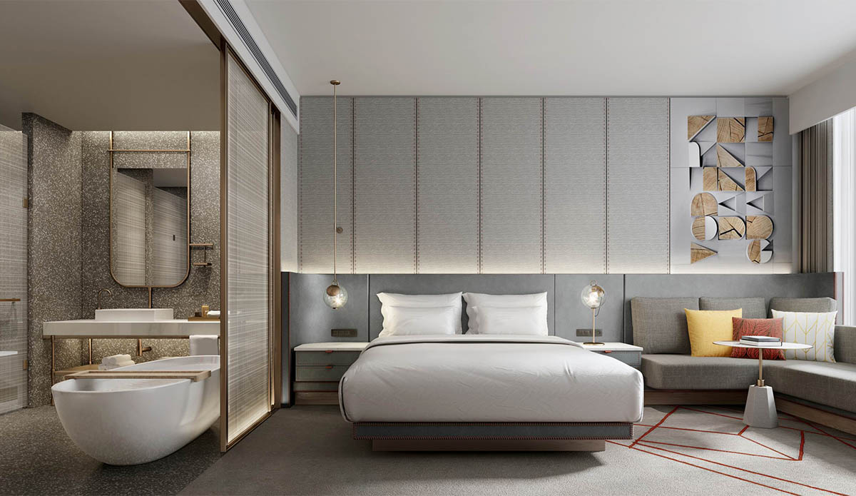 总建筑面积38181平方米,地上建筑面积28503平方米,地下建筑面积9678平方米,地上6层,地下1层。设计范围包括整个酒店室内公区、客房及后勤办公的功能区域。